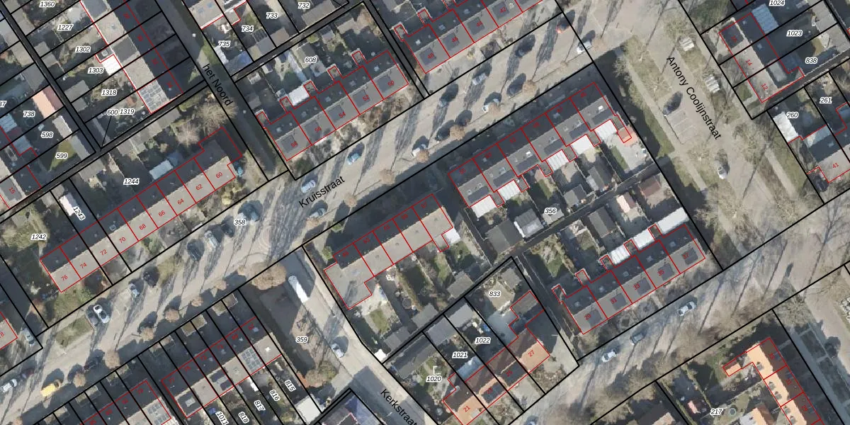 Het perceel waarop Kruisstraat 57 staat heeft een oppervlakte van 3615 m². Dit is een zeer groot perceel. De perceeloppervlakte wordt geregistreerd door het Kadaster. Gedetailleerde informatie over de maten van dit perceel kunt u vinden in het rapport Kadastrale kaart met maatvoering van Kruisstraat 57.