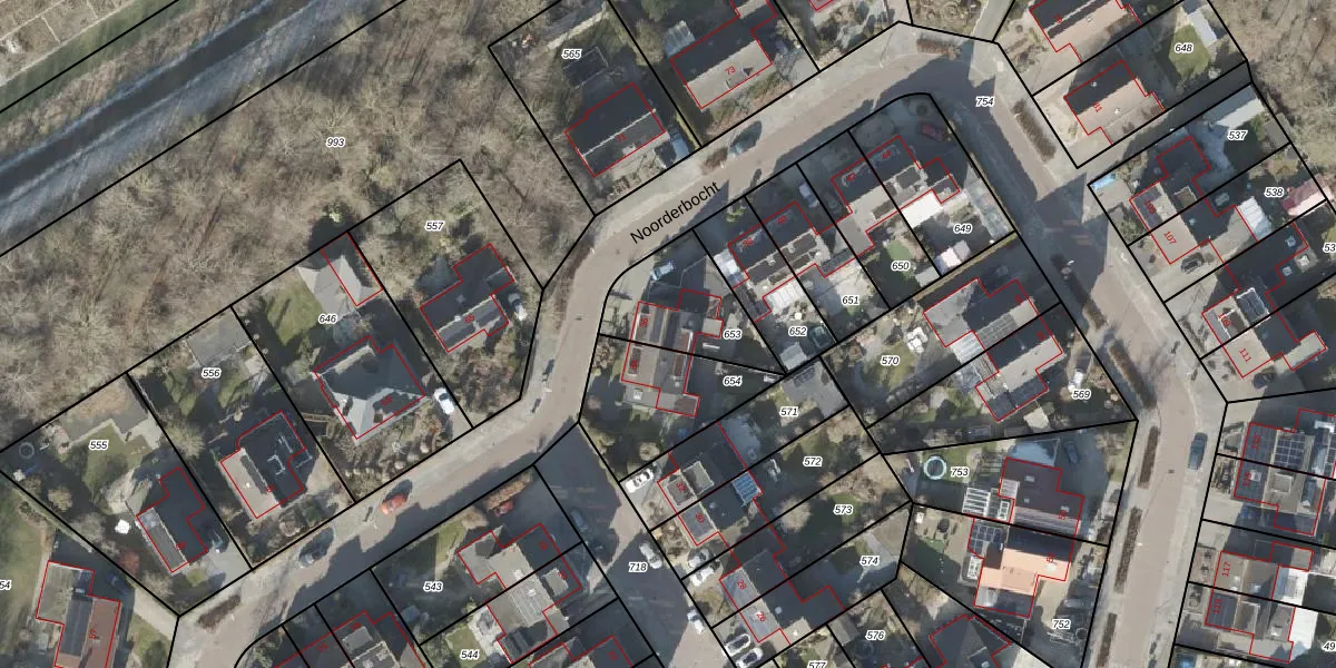 Het perceel waarop Noorderbocht 36 staat heeft een oppervlakte van 308 m². Dit is een groot perceel. De perceeloppervlakte wordt geregistreerd door het Kadaster. Gedetailleerde informatie over de maten van dit perceel kunt u vinden in het rapport Kadastrale kaart met maatvoering van Noorderbocht 36.
