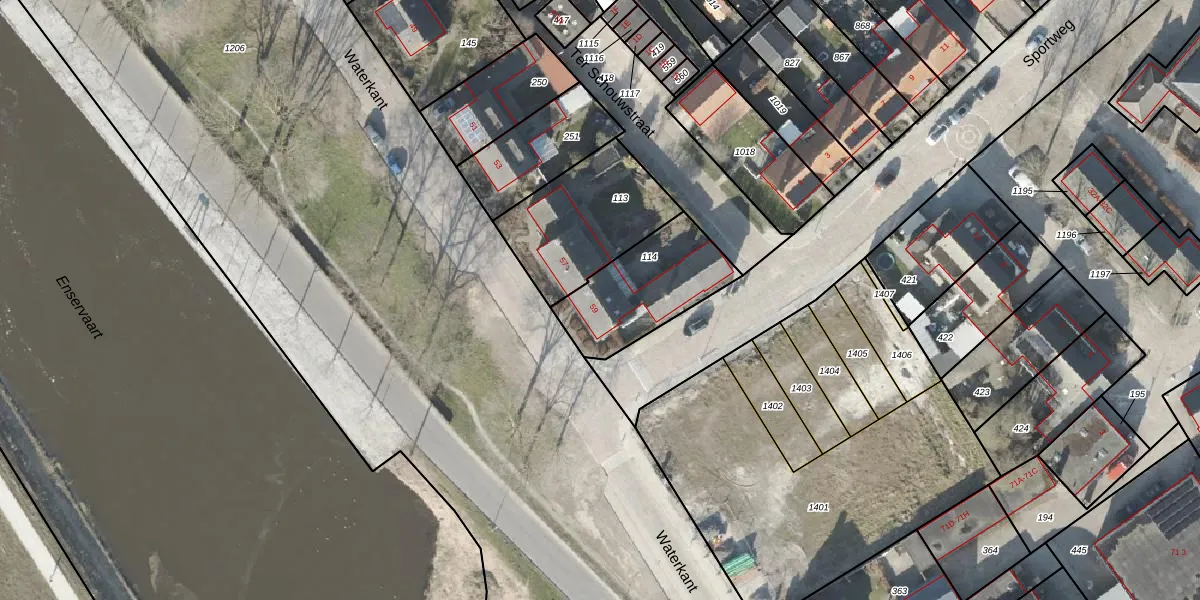 Het perceel waarop Waterkant 59 staat heeft een oppervlakte van 382 m². Dit is een groot perceel. De perceeloppervlakte wordt geregistreerd door het Kadaster. Gedetailleerde informatie over de maten van dit perceel kunt u vinden in het rapport Kadastrale kaart met maatvoering van Waterkant 59.