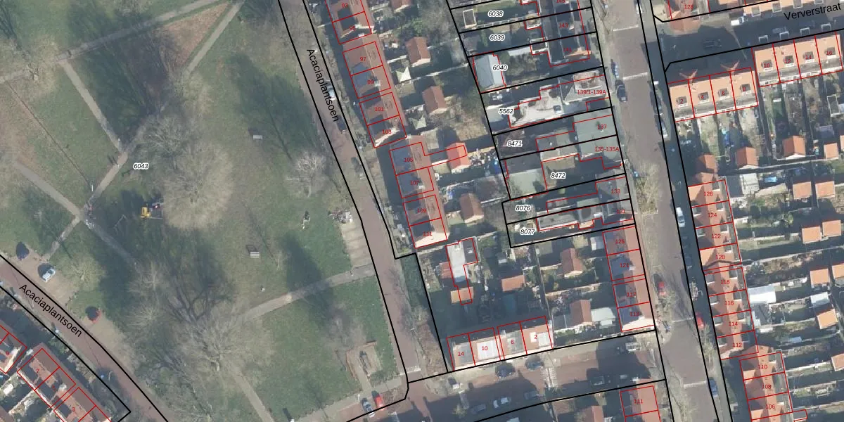 Het perceel waarop Acaciaplantsoen 109 staat heeft een oppervlakte van 1,2 ha. Dit is een zeer groot perceel. De perceeloppervlakte wordt geregistreerd door het Kadaster. Gedetailleerde informatie over de maten van dit perceel kunt u vinden in het rapport Kadastrale kaart met maatvoering van Acaciaplantsoen 109.