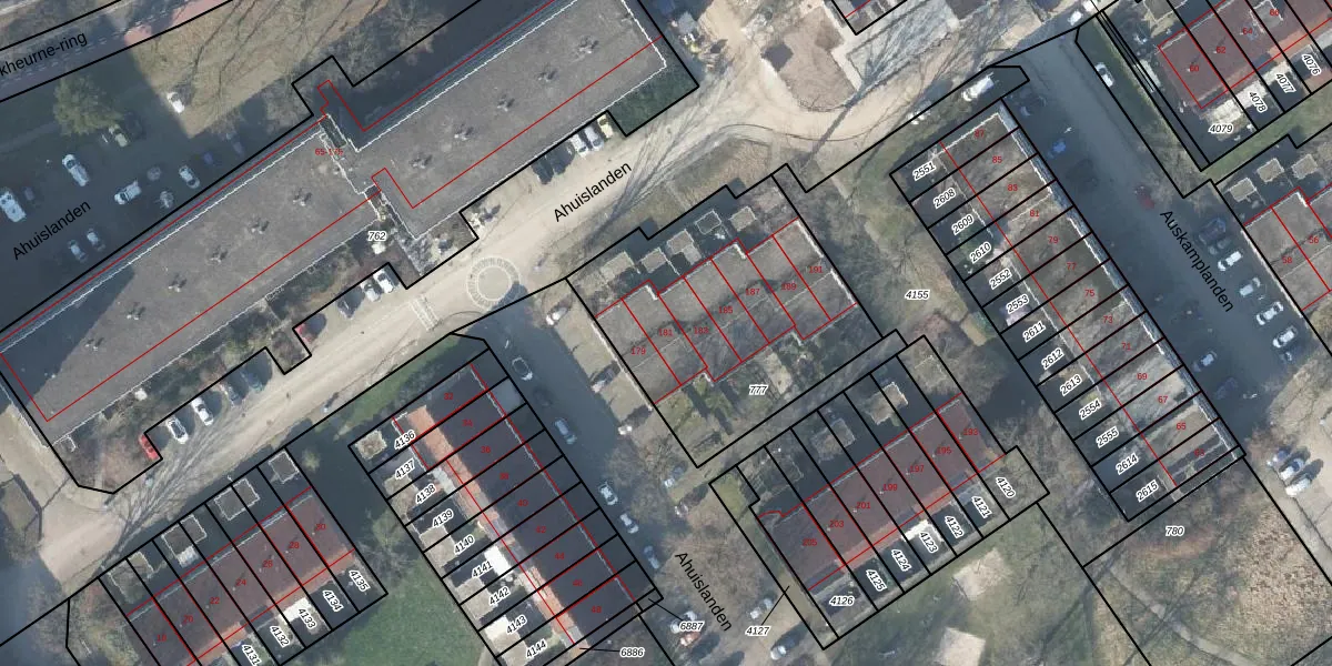Het perceel waarop Ahuislanden 181 staat heeft een oppervlakte van 1116 m². Dit is een zeer groot perceel. De perceeloppervlakte wordt geregistreerd door het Kadaster. Gedetailleerde informatie over de maten van dit perceel kunt u vinden in het rapport Kadastrale kaart met maatvoering van Ahuislanden 181.
