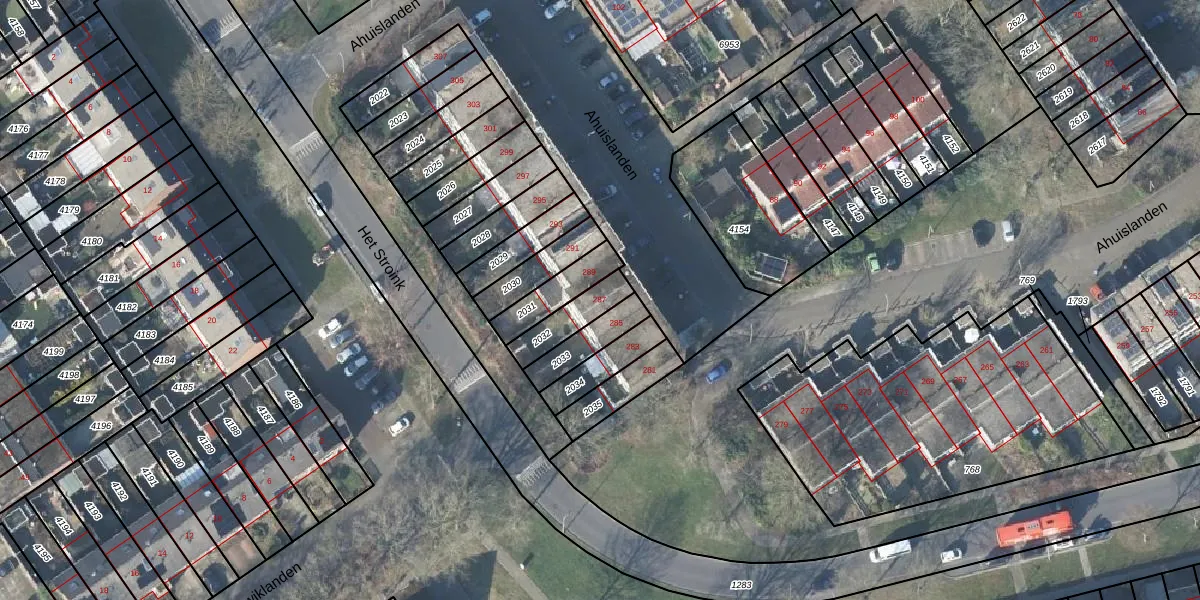 Ahuislanden 287 is gelegen op kadastraal perceel LNK00Z2032. Deze kadastrale aanduiding is uniek en wordt gebruikt door het Kadaster om eigendomsrechten en andere zakelijke rechten vast te leggen. Het perceel maakt onderdeel uit van de kadastrale gemeente Lonneker.