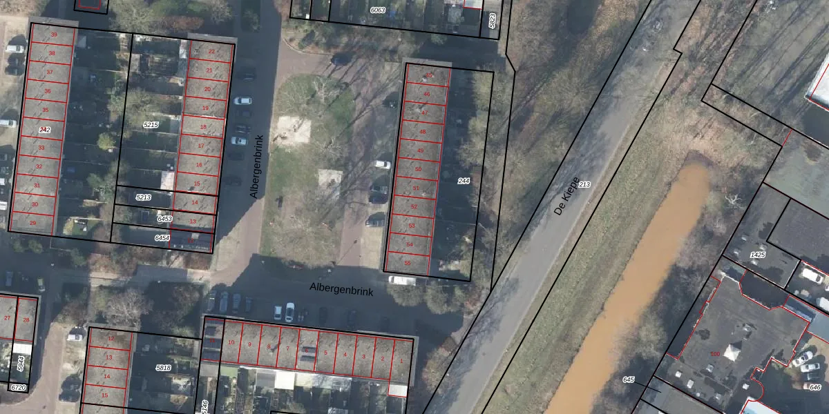 Het perceel waarop Albergenbrink 52 staat heeft een oppervlakte van 1063 m². Dit is een zeer groot perceel. De perceeloppervlakte wordt geregistreerd door het Kadaster. Gedetailleerde informatie over de maten van dit perceel kunt u vinden in het rapport Kadastrale kaart met maatvoering van Albergenbrink 52.