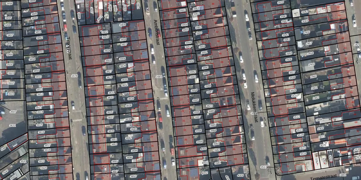 Het perceel waarop Ambonstraat 25 staat heeft een oppervlakte van 91 m². Dit is een klein perceel. De perceeloppervlakte wordt geregistreerd door het Kadaster. Gedetailleerde informatie over de maten van dit perceel kunt u vinden in het rapport Kadastrale kaart met maatvoering van Ambonstraat 25.