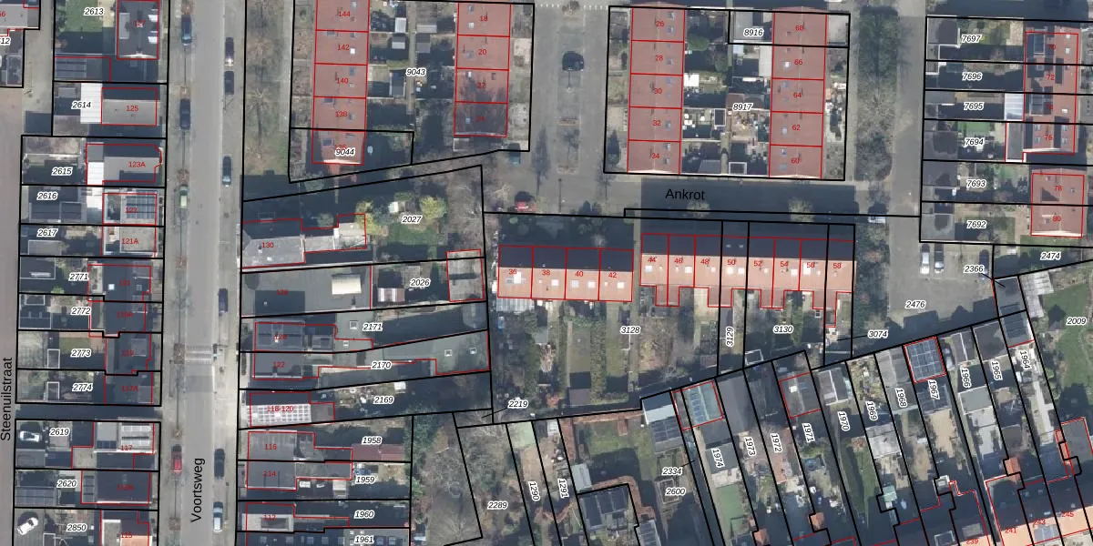 Het perceel waarop Ankrot 38 staat heeft een oppervlakte van 1475 m². Dit is een zeer groot perceel. De perceeloppervlakte wordt geregistreerd door het Kadaster. Gedetailleerde informatie over de maten van dit perceel kunt u vinden in het rapport Kadastrale kaart met maatvoering van Ankrot 38.