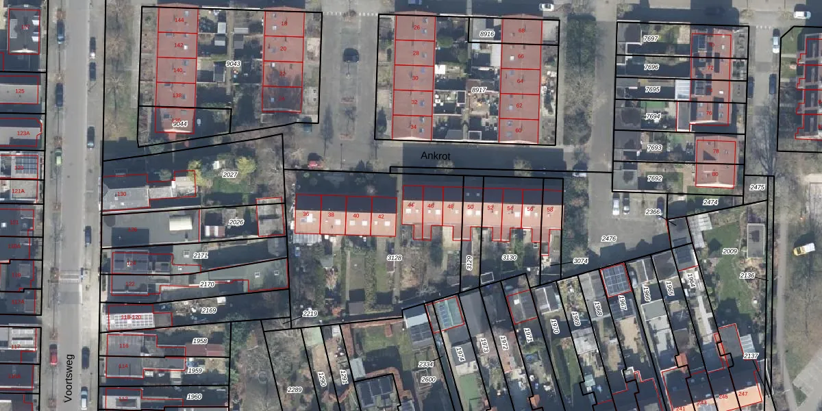 Het perceel waarop Ankrot 44 staat heeft een oppervlakte van 1475 m². Dit is een zeer groot perceel. De perceeloppervlakte wordt geregistreerd door het Kadaster. Gedetailleerde informatie over de maten van dit perceel kunt u vinden in het rapport Kadastrale kaart met maatvoering van Ankrot 44.