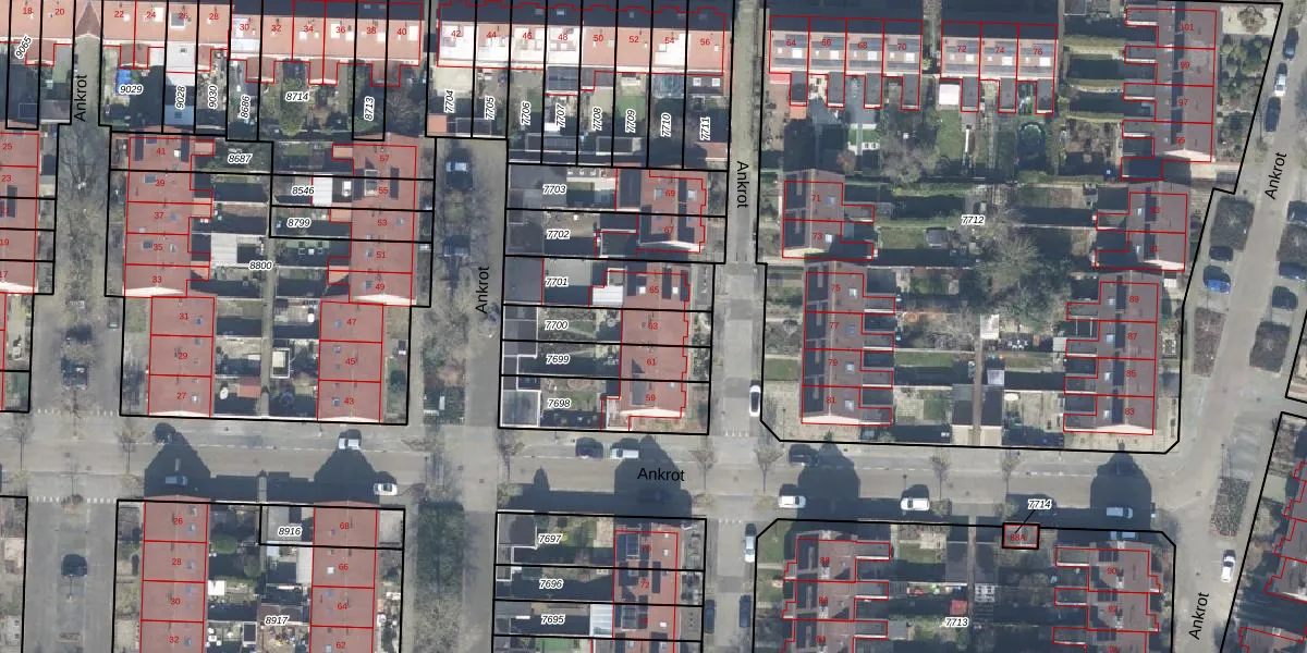 Het perceel waarop Ankrot 63 staat heeft een oppervlakte van 174 m². Dit is een middelgroot perceel. De perceeloppervlakte wordt geregistreerd door het Kadaster. Gedetailleerde informatie over de maten van dit perceel kunt u vinden in het rapport Kadastrale kaart met maatvoering van Ankrot 63.