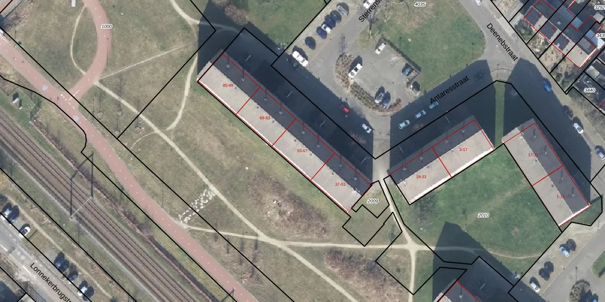 Antaresstraat 53 is gelegen op kadastraal perceel LNK00S2011. Deze kadastrale aanduiding is uniek en wordt gebruikt door het Kadaster om eigendomsrechten en andere zakelijke rechten vast te leggen. Het perceel maakt onderdeel uit van de kadastrale gemeente Lonneker.