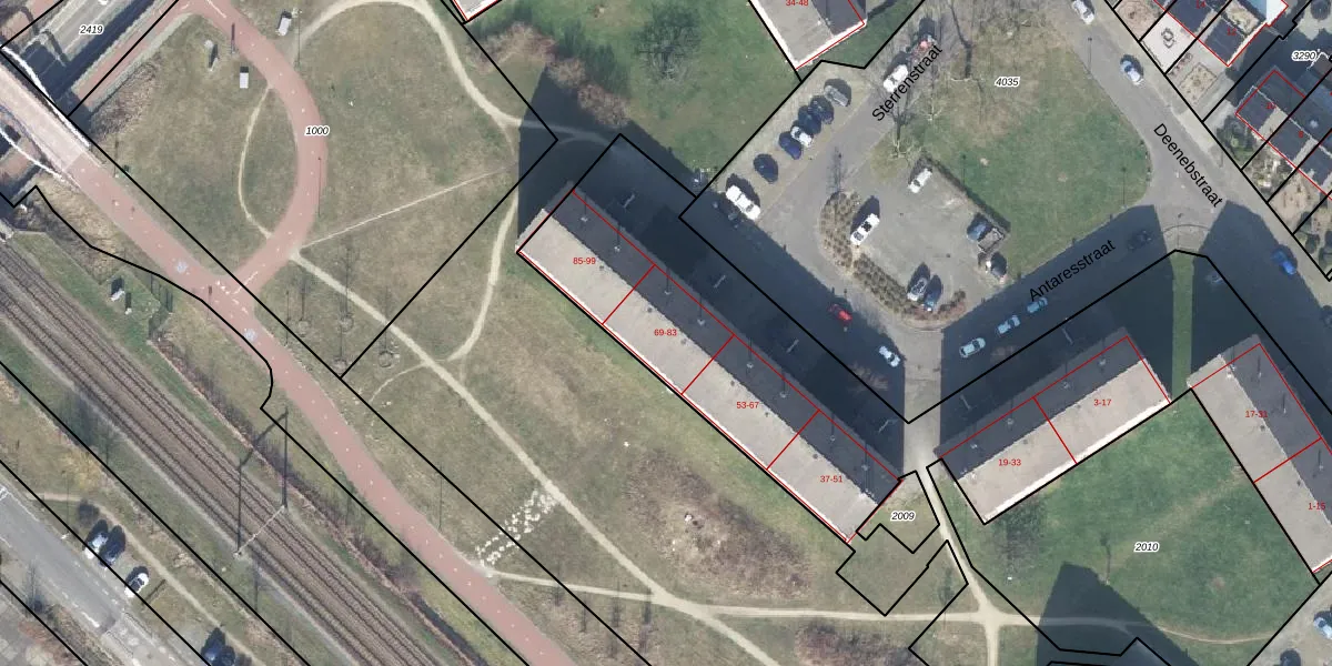 Het perceel waarop Antaresstraat 77 staat heeft een oppervlakte van 1,2 ha. Dit is een zeer groot perceel. De perceeloppervlakte wordt geregistreerd door het Kadaster. Gedetailleerde informatie over de maten van dit perceel kunt u vinden in het rapport Kadastrale kaart met maatvoering van Antaresstraat 77.