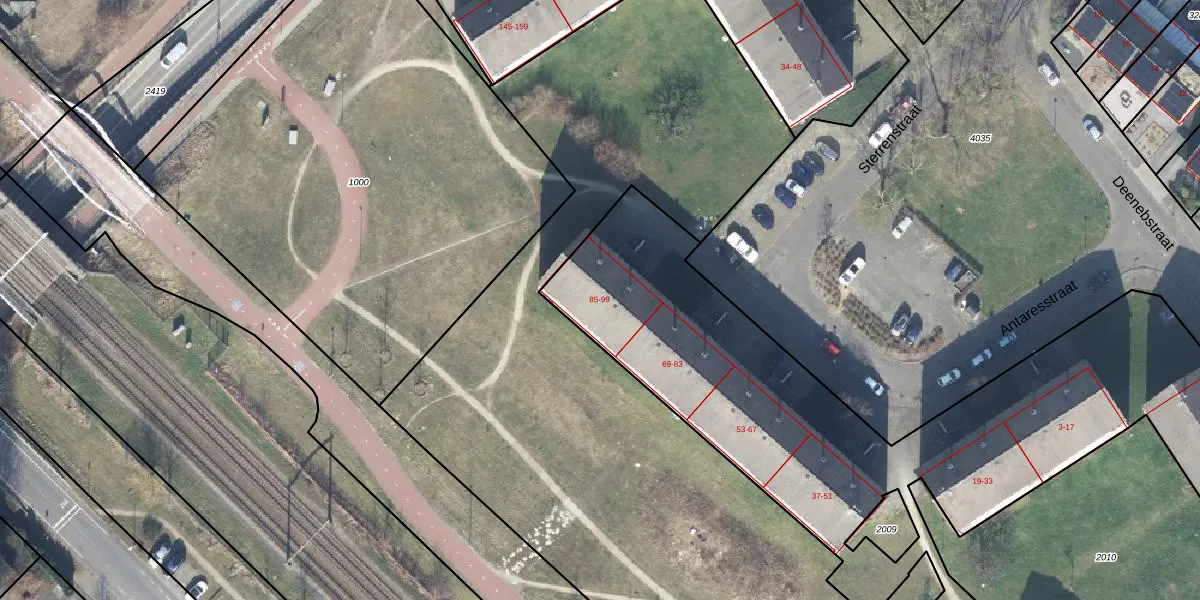 Het perceel waarop Antaresstraat 97 staat heeft een oppervlakte van 1,2 ha. Dit is een zeer groot perceel. De perceeloppervlakte wordt geregistreerd door het Kadaster. Gedetailleerde informatie over de maten van dit perceel kunt u vinden in het rapport Kadastrale kaart met maatvoering van Antaresstraat 97.