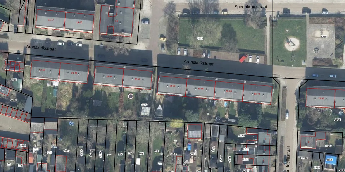 Het perceel waarop Aronskelkstraat 44 staat heeft een oppervlakte van 4725 m². Dit is een zeer groot perceel. De perceeloppervlakte wordt geregistreerd door het Kadaster. Gedetailleerde informatie over de maten van dit perceel kunt u vinden in het rapport Kadastrale kaart met maatvoering van Aronskelkstraat 44.