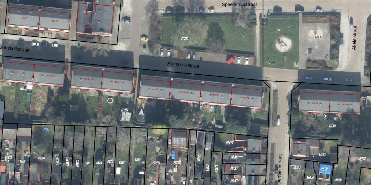 Het perceel waarop Aronskelkstraat 56 staat heeft een oppervlakte van 4725 m². Dit is een zeer groot perceel. De perceeloppervlakte wordt geregistreerd door het Kadaster. Gedetailleerde informatie over de maten van dit perceel kunt u vinden in het rapport Kadastrale kaart met maatvoering van Aronskelkstraat 56.