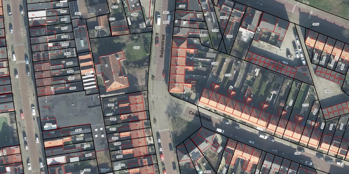 Het perceel waarop Batjanstraat 19 staat heeft een oppervlakte van 2382 m². Dit is een zeer groot perceel. De perceeloppervlakte wordt geregistreerd door het Kadaster. Gedetailleerde informatie over de maten van dit perceel kunt u vinden in het rapport Kadastrale kaart met maatvoering van Batjanstraat 19.