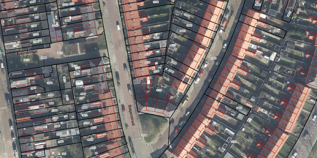 Het perceel waarop Batjanstraat 53 staat heeft een oppervlakte van 737 m². Dit is een groot perceel. De perceeloppervlakte wordt geregistreerd door het Kadaster. Gedetailleerde informatie over de maten van dit perceel kunt u vinden in het rapport Kadastrale kaart met maatvoering van Batjanstraat 53.