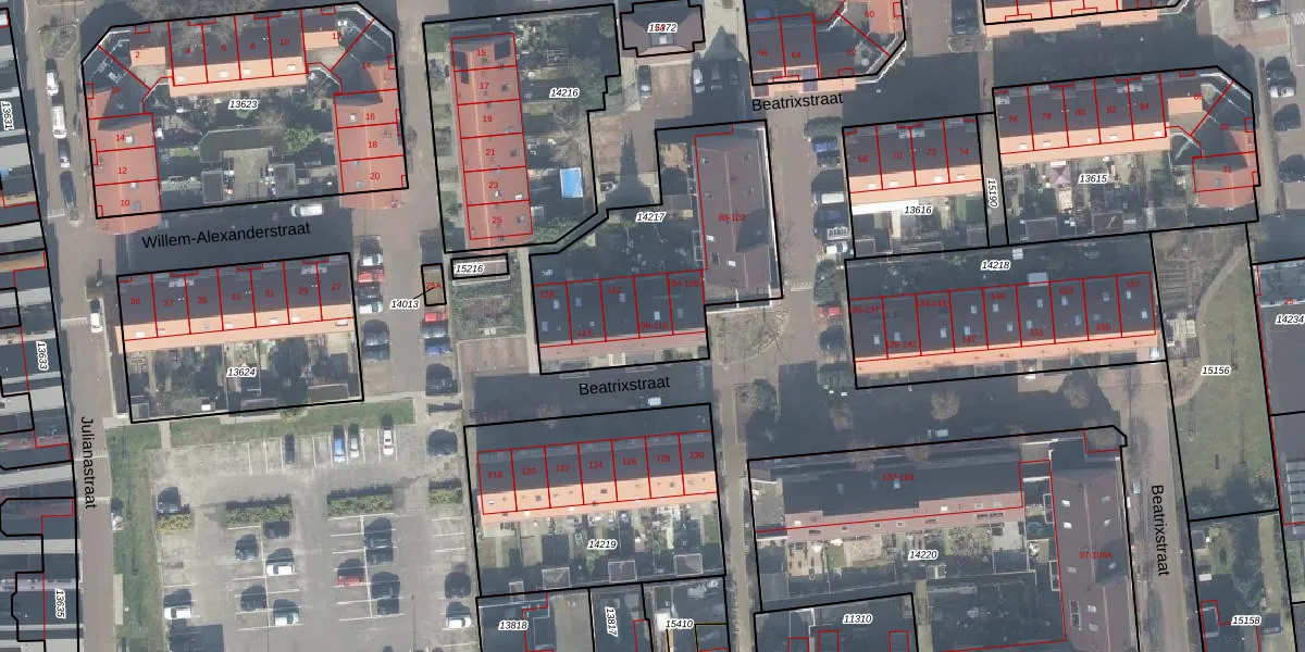 Het perceel waarop Beatrixstraat 110 staat heeft een oppervlakte van 956 m². Dit is een groot perceel. De perceeloppervlakte wordt geregistreerd door het Kadaster. Gedetailleerde informatie over de maten van dit perceel kunt u vinden in het rapport Kadastrale kaart met maatvoering van Beatrixstraat 110.