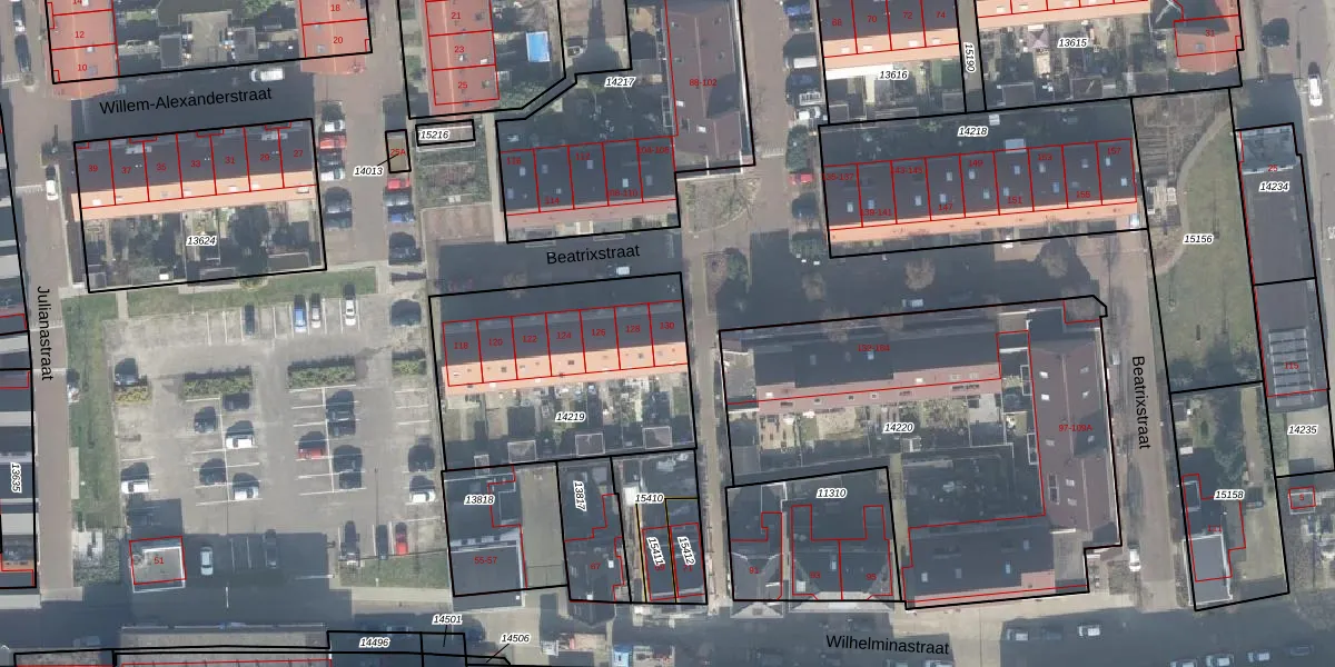 Het perceel waarop Beatrixstraat 130 staat heeft een oppervlakte van 993 m². Dit is een groot perceel. De perceeloppervlakte wordt geregistreerd door het Kadaster. Gedetailleerde informatie over de maten van dit perceel kunt u vinden in het rapport Kadastrale kaart met maatvoering van Beatrixstraat 130.