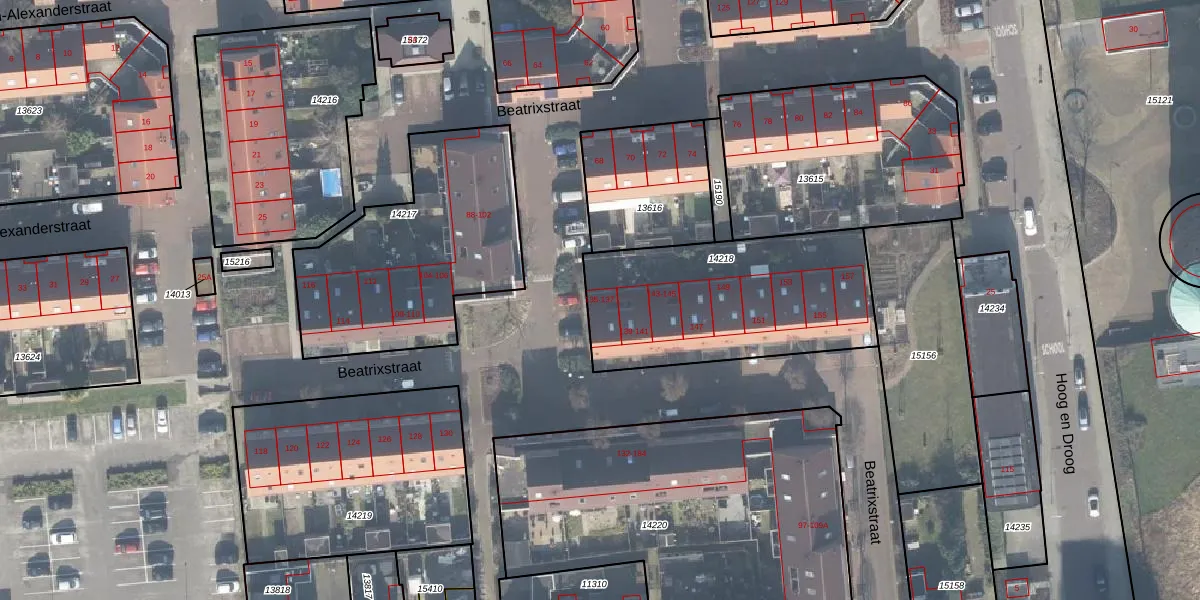 Het perceel waarop Beatrixstraat 135 staat heeft een oppervlakte van 934 m². Dit is een groot perceel. De perceeloppervlakte wordt geregistreerd door het Kadaster. Gedetailleerde informatie over de maten van dit perceel kunt u vinden in het rapport Kadastrale kaart met maatvoering van Beatrixstraat 135.