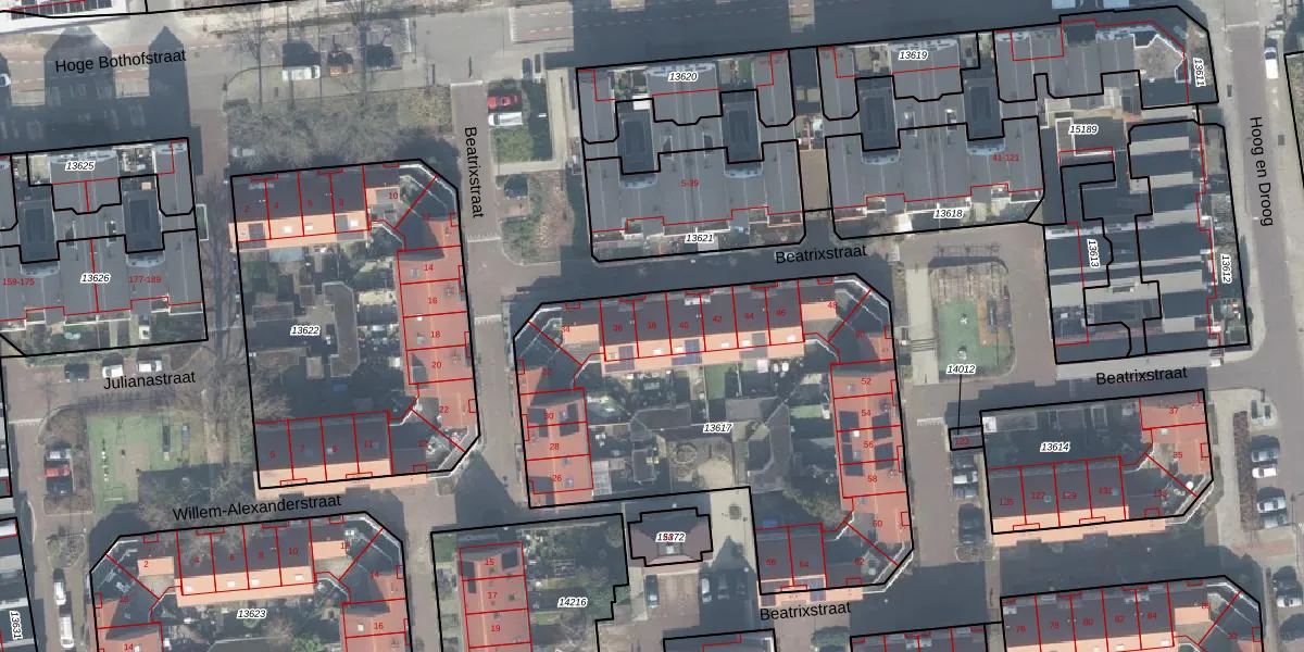 Beatrixstraat 38 is gelegen op kadastraal perceel ESD00D13617. Deze kadastrale aanduiding is uniek en wordt gebruikt door het Kadaster om eigendomsrechten en andere zakelijke rechten vast te leggen. Het perceel maakt onderdeel uit van de kadastrale gemeente Enschede.