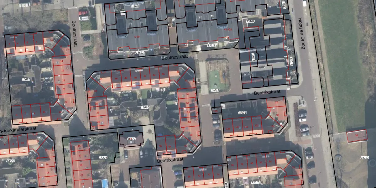 Het perceel waarop Beatrixstraat 52 staat heeft een oppervlakte van 2180 m². Dit is een zeer groot perceel. De perceeloppervlakte wordt geregistreerd door het Kadaster. Gedetailleerde informatie over de maten van dit perceel kunt u vinden in het rapport Kadastrale kaart met maatvoering van Beatrixstraat 52.
