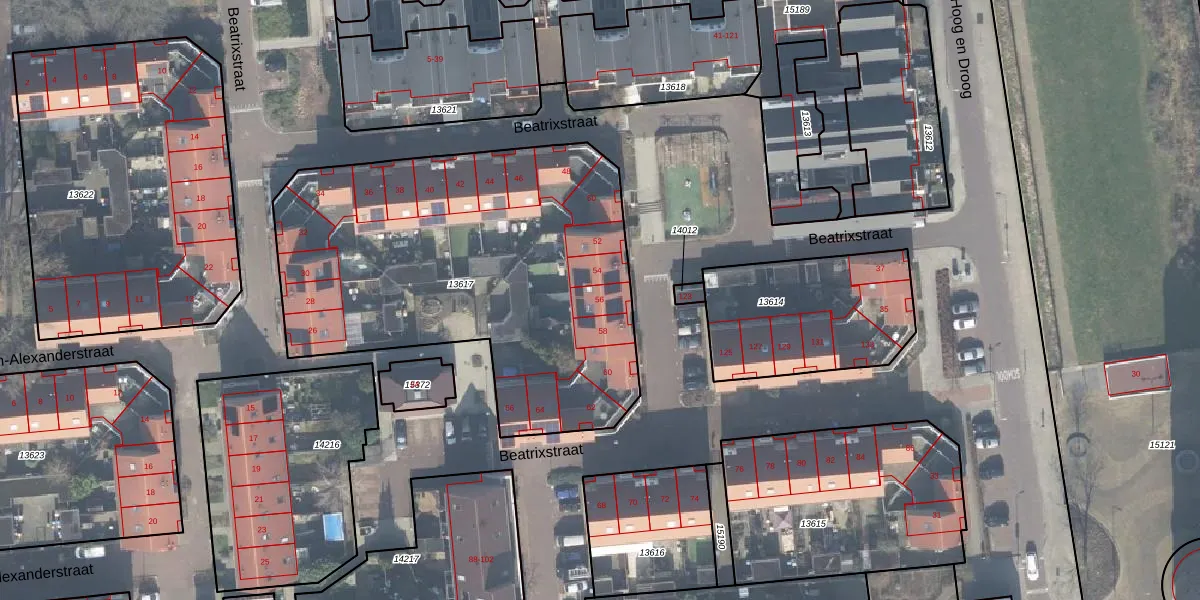 Het perceel waarop Beatrixstraat 56 staat heeft een oppervlakte van 2180 m². Dit is een zeer groot perceel. De perceeloppervlakte wordt geregistreerd door het Kadaster. Gedetailleerde informatie over de maten van dit perceel kunt u vinden in het rapport Kadastrale kaart met maatvoering van Beatrixstraat 56.