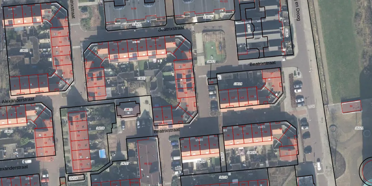Het perceel waarop Beatrixstraat 58 staat heeft een oppervlakte van 2180 m². Dit is een zeer groot perceel. De perceeloppervlakte wordt geregistreerd door het Kadaster. Gedetailleerde informatie over de maten van dit perceel kunt u vinden in het rapport Kadastrale kaart met maatvoering van Beatrixstraat 58.