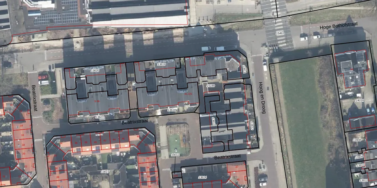 Het perceel waarop Beatrixstraat 63 staat heeft een oppervlakte van 479 m². Dit is een groot perceel. De perceeloppervlakte wordt geregistreerd door het Kadaster. Gedetailleerde informatie over de maten van dit perceel kunt u vinden in het rapport Kadastrale kaart met maatvoering van Beatrixstraat 63.