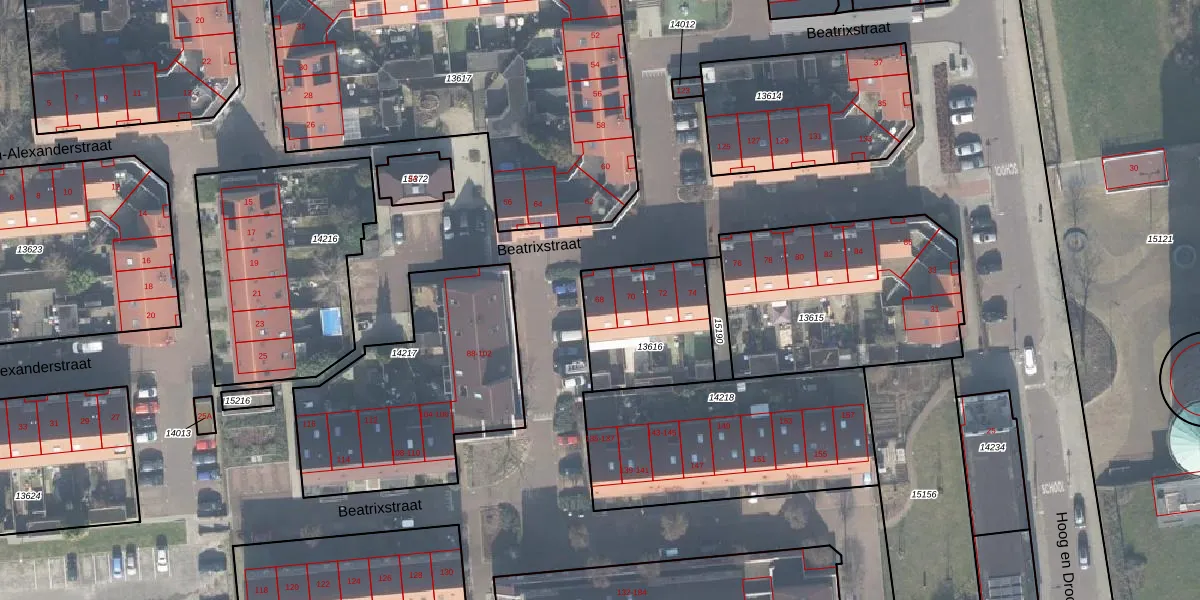 Het perceel waarop Beatrixstraat 68 staat heeft een oppervlakte van 423 m². Dit is een groot perceel. De perceeloppervlakte wordt geregistreerd door het Kadaster. Gedetailleerde informatie over de maten van dit perceel kunt u vinden in het rapport Kadastrale kaart met maatvoering van Beatrixstraat 68.