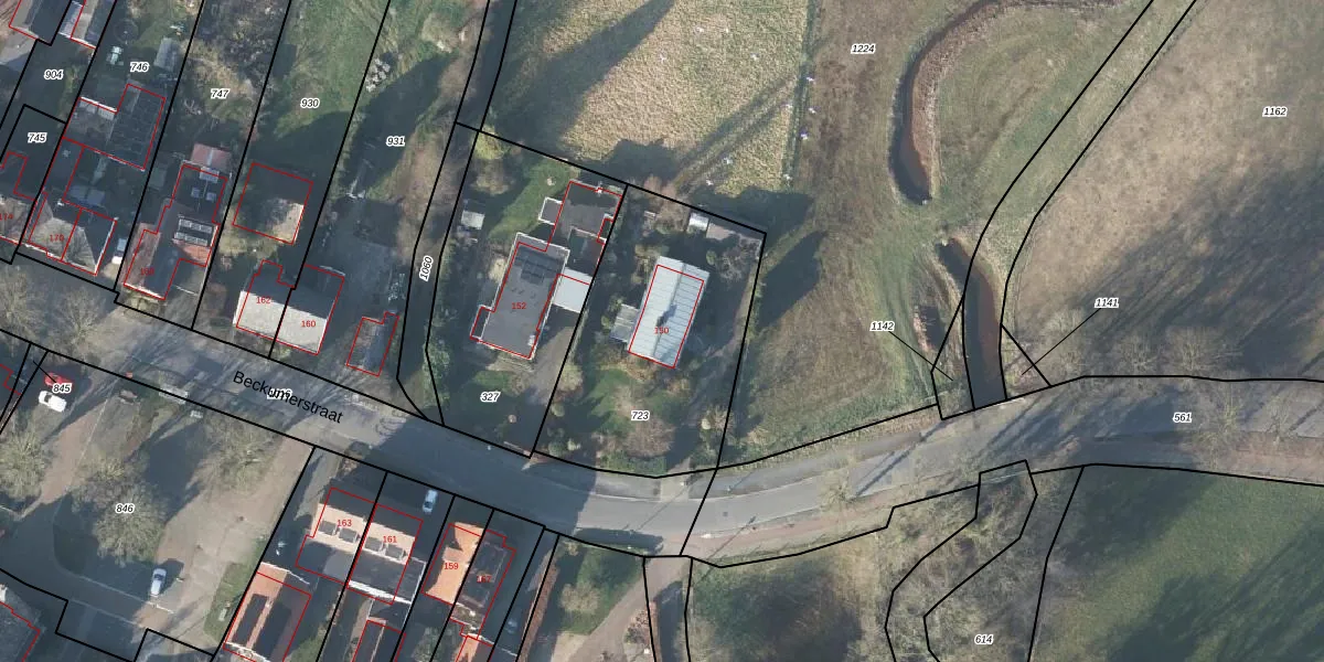 Het perceel waarop Beckumerstraat 150 staat heeft een oppervlakte van 1021 m². Dit is een zeer groot perceel. De perceeloppervlakte wordt geregistreerd door het Kadaster. Gedetailleerde informatie over de maten van dit perceel kunt u vinden in het rapport Kadastrale kaart met maatvoering van Beckumerstraat 150.