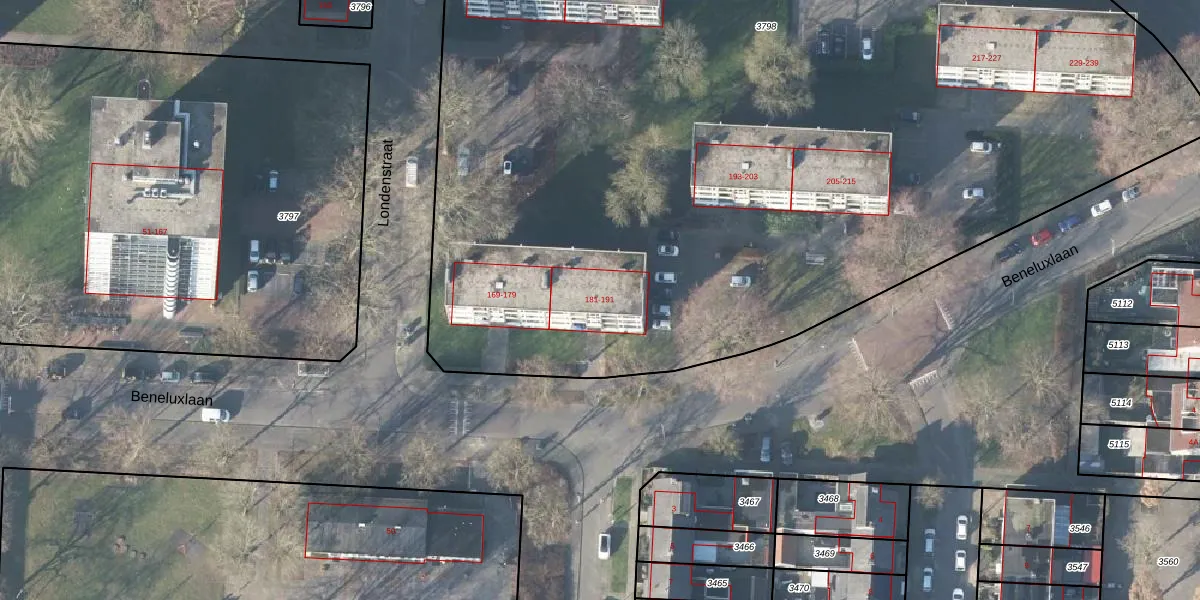 Beneluxlaan 187 is gelegen op kadastraal perceel LNK00H3798. Deze kadastrale aanduiding is uniek en wordt gebruikt door het Kadaster om eigendomsrechten en andere zakelijke rechten vast te leggen. Het perceel maakt onderdeel uit van de kadastrale gemeente Lonneker.