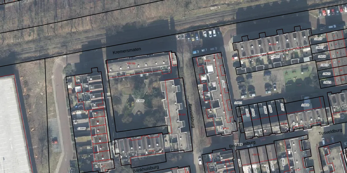 Het perceel waarop Benninkburg 107 staat heeft een oppervlakte van 2452 m². Dit is een zeer groot perceel. De perceeloppervlakte wordt geregistreerd door het Kadaster. Gedetailleerde informatie over de maten van dit perceel kunt u vinden in het rapport Kadastrale kaart met maatvoering van Benninkburg 107.