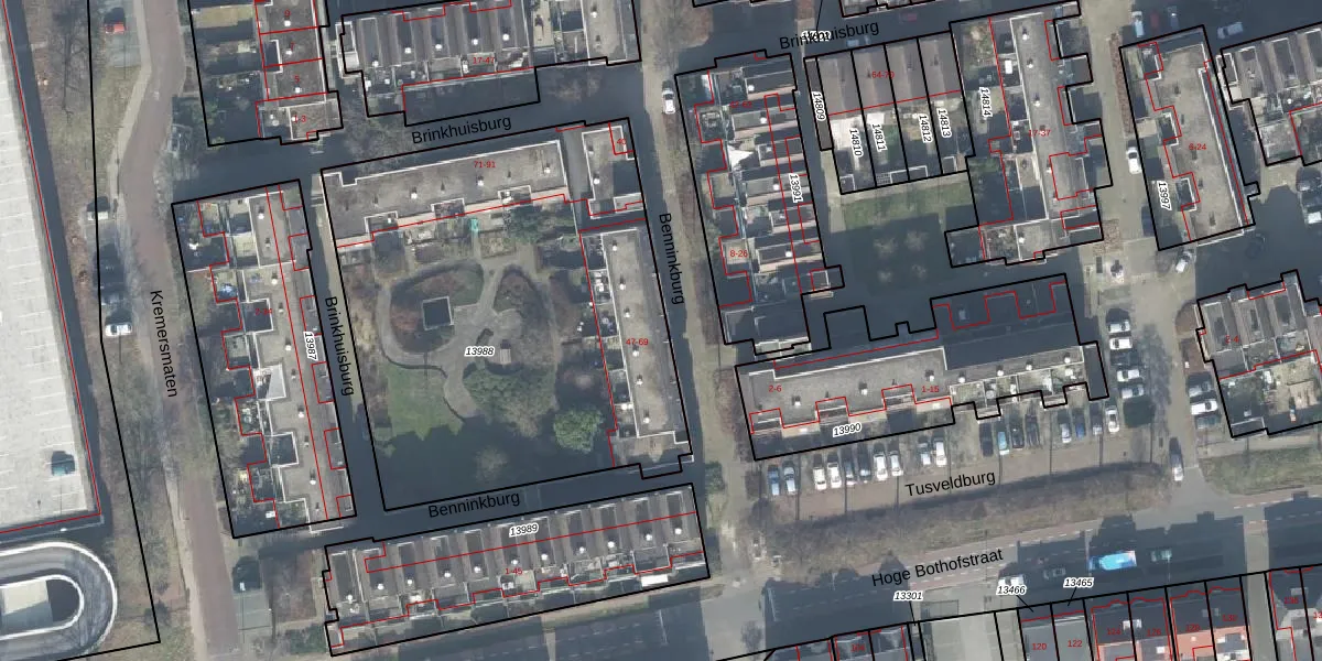 Het perceel waarop het adres ligt is ESD00-D-13988. De afkorting 'ESD00' staat voor kadastrale gemeente Enschede. Het perceel is met 2495 m² relatief groot. Het gemiddelde ligt in de kadastrale gemeente Enschede op 546,72 m². Het kleinste perceel in de kadastrale gemeente is 0 m² groot. De grootste perceeloppervlakte is 10,7 ha. Op het perceel zijn 25 adressen aanwezig. De huidige grenzen van het perceel zijn digitaal in de Basisregistratie Kadaster (BRK) geregistreerd op 14-04-2010.