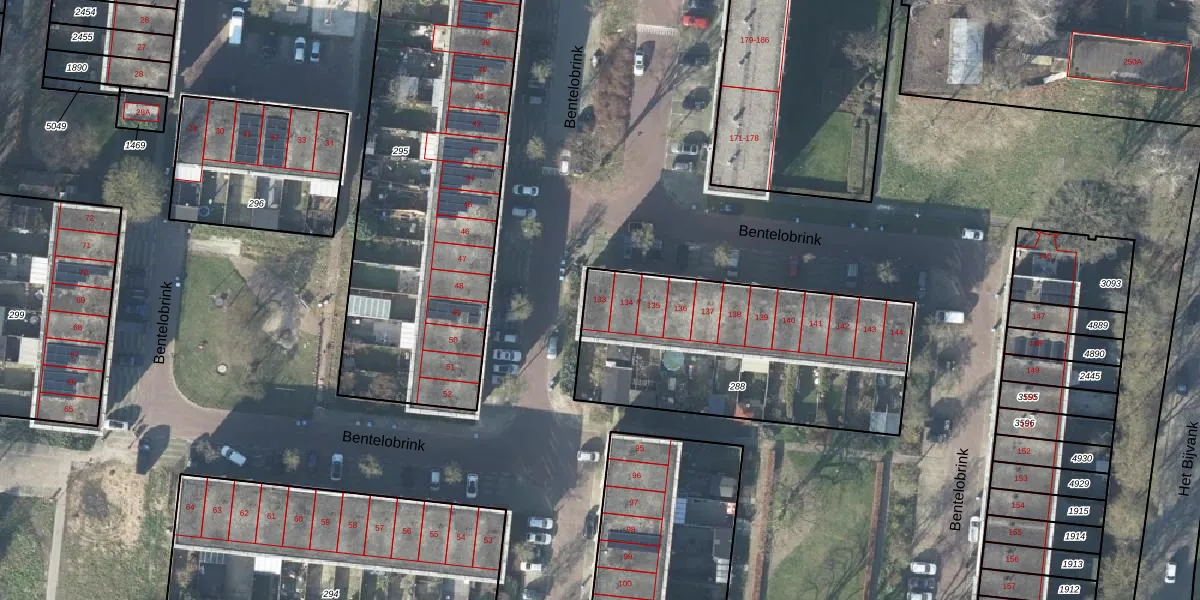 Het perceel waarop Bentelobrink 133 staat heeft een oppervlakte van 1206 m². Dit is een zeer groot perceel. De perceeloppervlakte wordt geregistreerd door het Kadaster. Gedetailleerde informatie over de maten van dit perceel kunt u vinden in het rapport Kadastrale kaart met maatvoering van Bentelobrink 133.