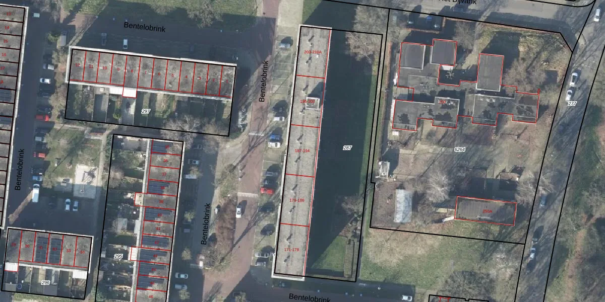 Bentelobrink 194 is gelegen op kadastraal perceel LNK00Z287. Deze kadastrale aanduiding is uniek en wordt gebruikt door het Kadaster om eigendomsrechten en andere zakelijke rechten vast te leggen. Het perceel maakt onderdeel uit van de kadastrale gemeente Lonneker.