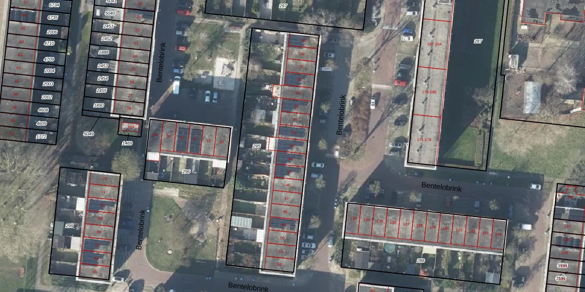 Het perceel waarop Bentelobrink 43 staat heeft een oppervlakte van 1894 m². Dit is een zeer groot perceel. De perceeloppervlakte wordt geregistreerd door het Kadaster. Gedetailleerde informatie over de maten van dit perceel kunt u vinden in het rapport Kadastrale kaart met maatvoering van Bentelobrink 43.