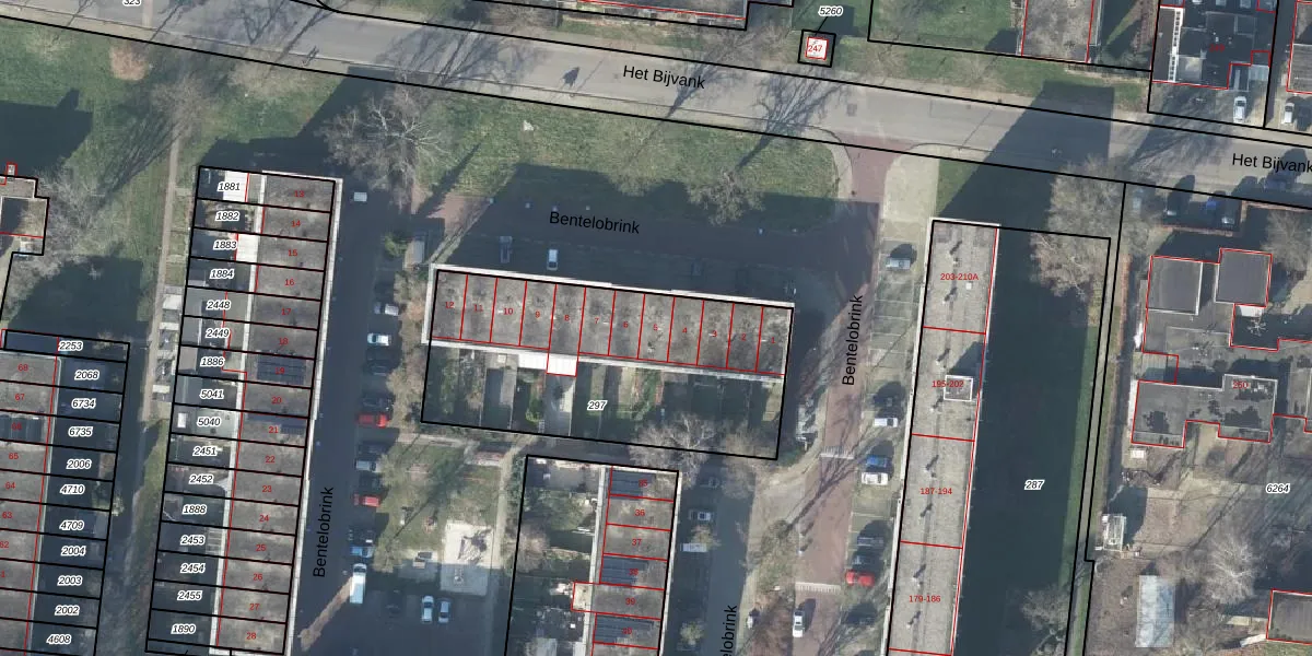 Het perceel waarop Bentelobrink 5 staat heeft een oppervlakte van 1268 m². Dit is een zeer groot perceel. De perceeloppervlakte wordt geregistreerd door het Kadaster. Gedetailleerde informatie over de maten van dit perceel kunt u vinden in het rapport Kadastrale kaart met maatvoering van Bentelobrink 5.