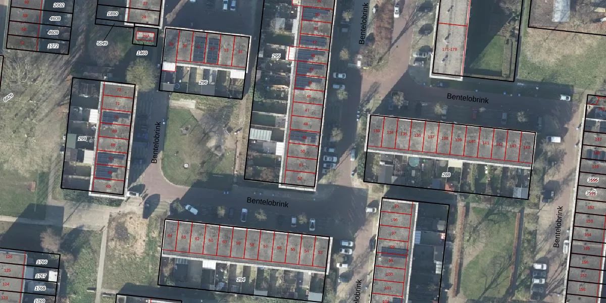 Het perceel waarop Bentelobrink 50 staat heeft een oppervlakte van 1894 m². Dit is een zeer groot perceel. De perceeloppervlakte wordt geregistreerd door het Kadaster. Gedetailleerde informatie over de maten van dit perceel kunt u vinden in het rapport Kadastrale kaart met maatvoering van Bentelobrink 50.