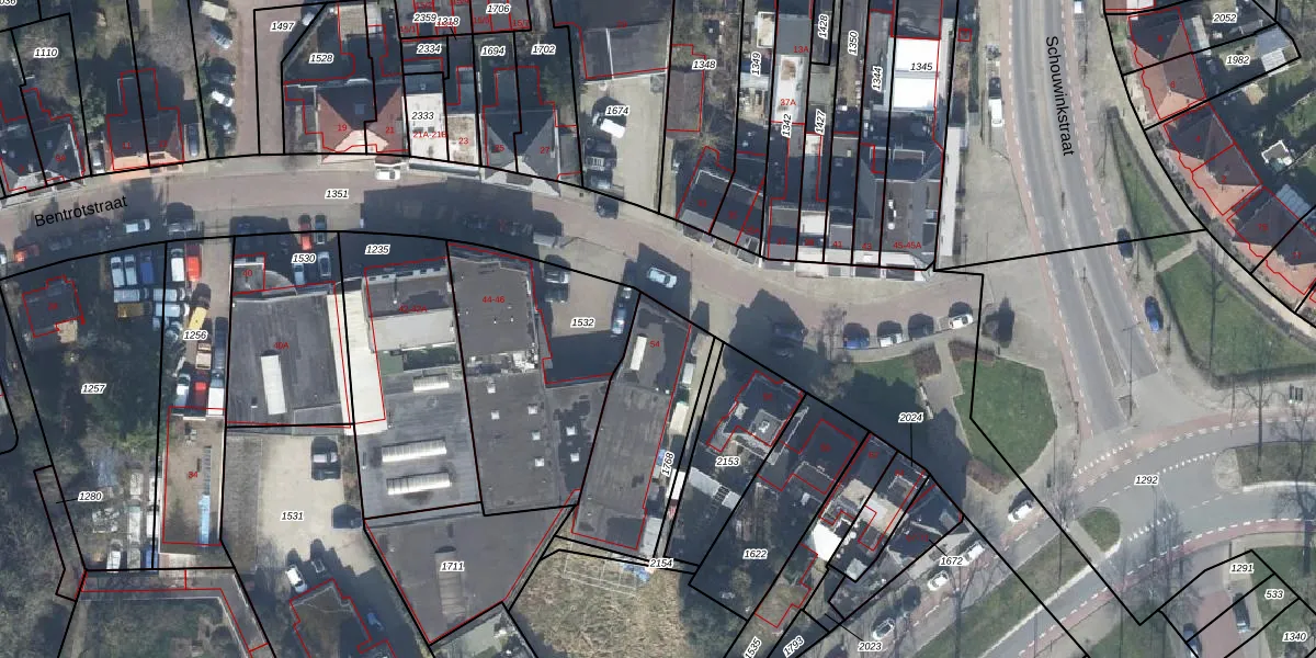 Het perceel waarop Bentrotstraat 54 staat heeft een oppervlakte van 496 m². Dit is een groot perceel. De perceeloppervlakte wordt geregistreerd door het Kadaster. Gedetailleerde informatie over de maten van dit perceel kunt u vinden in het rapport Kadastrale kaart met maatvoering van Bentrotstraat 54.