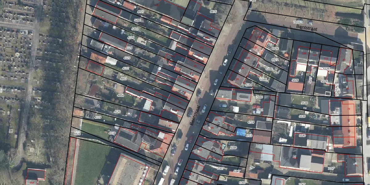 Het perceel waarop Bentstraat 93 staat heeft een oppervlakte van 350 m². Dit is een groot perceel. De perceeloppervlakte wordt geregistreerd door het Kadaster. Gedetailleerde informatie over de maten van dit perceel kunt u vinden in het rapport Kadastrale kaart met maatvoering van Bentstraat 93.