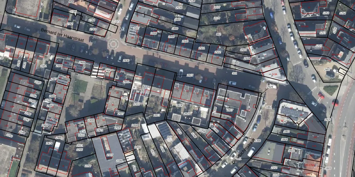 Het perceel waarop Bernard ter Haarstraat 21 staat heeft een oppervlakte van 543 m². Dit is een groot perceel. De perceeloppervlakte wordt geregistreerd door het Kadaster. Gedetailleerde informatie over de maten van dit perceel kunt u vinden in het rapport Kadastrale kaart met maatvoering van Bernard ter Haarstraat 21.