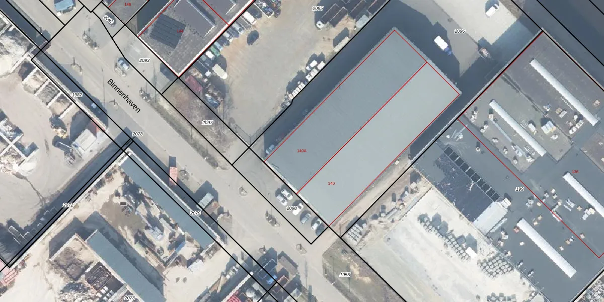 Het perceel waarop Binnenhaven 140-A staat heeft een oppervlakte van 4118 m². Dit is een zeer groot perceel. De perceeloppervlakte wordt geregistreerd door het Kadaster. Gedetailleerde informatie over de maten van dit perceel kunt u vinden in het rapport Kadastrale kaart met maatvoering van Binnenhaven 140-A.