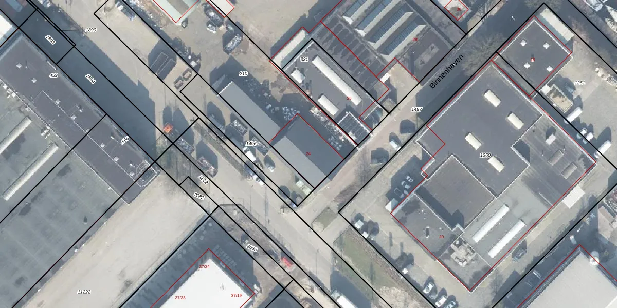Het perceel waarop Binnenhaven 24 staat heeft een oppervlakte van 1819 m². Dit is een zeer groot perceel. De perceeloppervlakte wordt geregistreerd door het Kadaster. Gedetailleerde informatie over de maten van dit perceel kunt u vinden in het rapport Kadastrale kaart met maatvoering van Binnenhaven 24.