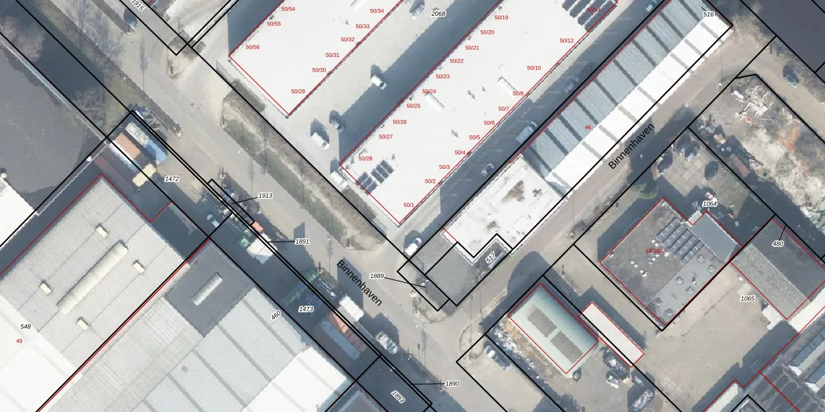 Het perceel waarop Binnenhaven 50-1 staat heeft een oppervlakte van 7027 m². Dit is een zeer groot perceel. De perceeloppervlakte wordt geregistreerd door het Kadaster. Gedetailleerde informatie over de maten van dit perceel kunt u vinden in het rapport Kadastrale kaart met maatvoering van Binnenhaven 50-1.