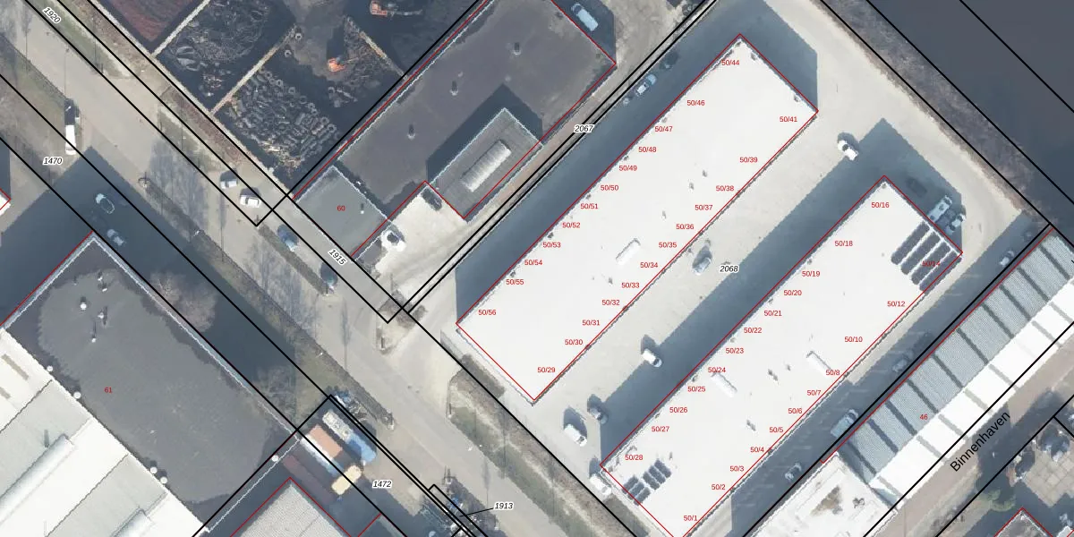 Het perceel waarop Binnenhaven 50-54 staat heeft een oppervlakte van 7027 m². Dit is een zeer groot perceel. De perceeloppervlakte wordt geregistreerd door het Kadaster. Gedetailleerde informatie over de maten van dit perceel kunt u vinden in het rapport Kadastrale kaart met maatvoering van Binnenhaven 50-54.
