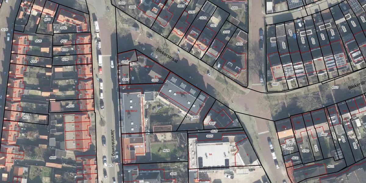 Blekerstraat 261-5 is gelegen op kadastraal perceel ESD00G3045. Deze kadastrale aanduiding is uniek en wordt gebruikt door het Kadaster om eigendomsrechten en andere zakelijke rechten vast te leggen. Het perceel maakt onderdeel uit van de kadastrale gemeente Enschede.