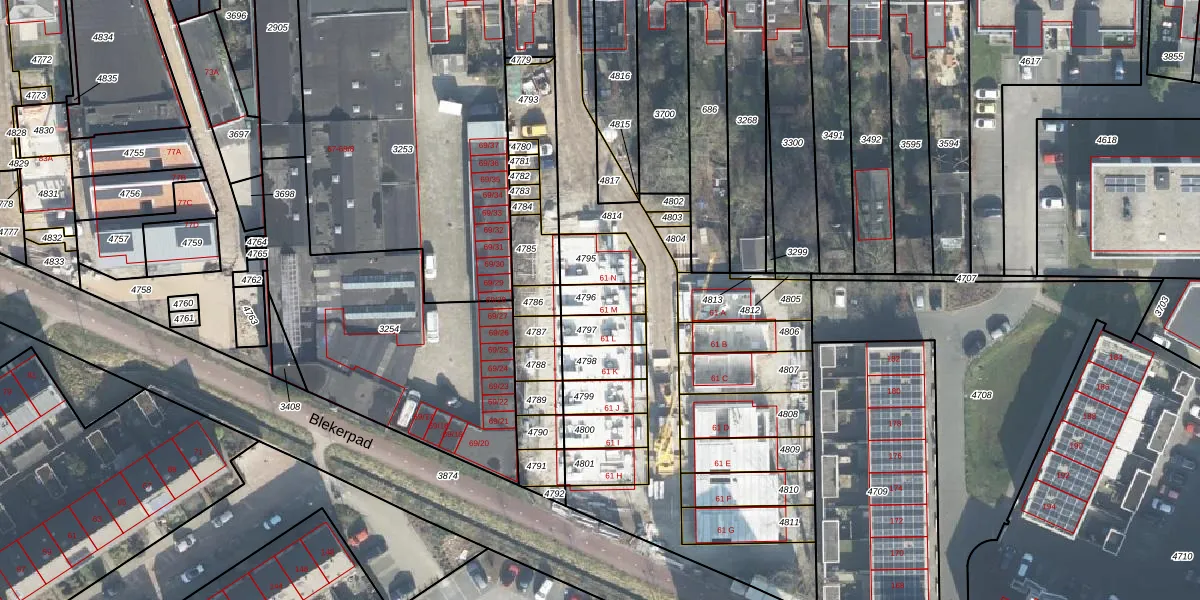 Het perceel waarop Blekerstraat 61-M staat heeft een oppervlakte van 72 m². Dit is een klein perceel. De perceeloppervlakte wordt geregistreerd door het Kadaster. Gedetailleerde informatie over de maten van dit perceel kunt u vinden in het rapport Kadastrale kaart met maatvoering van Blekerstraat 61-M.