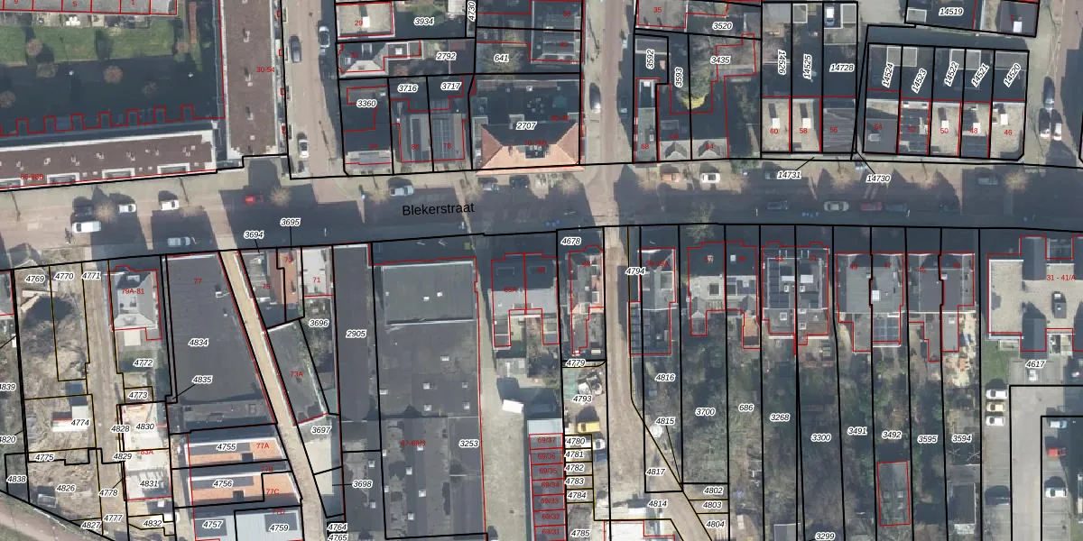 Het perceel waarop Blekerstraat 65 staat heeft een oppervlakte van 2005 m². Dit is een zeer groot perceel. De perceeloppervlakte wordt geregistreerd door het Kadaster. Gedetailleerde informatie over de maten van dit perceel kunt u vinden in het rapport Kadastrale kaart met maatvoering van Blekerstraat 65.