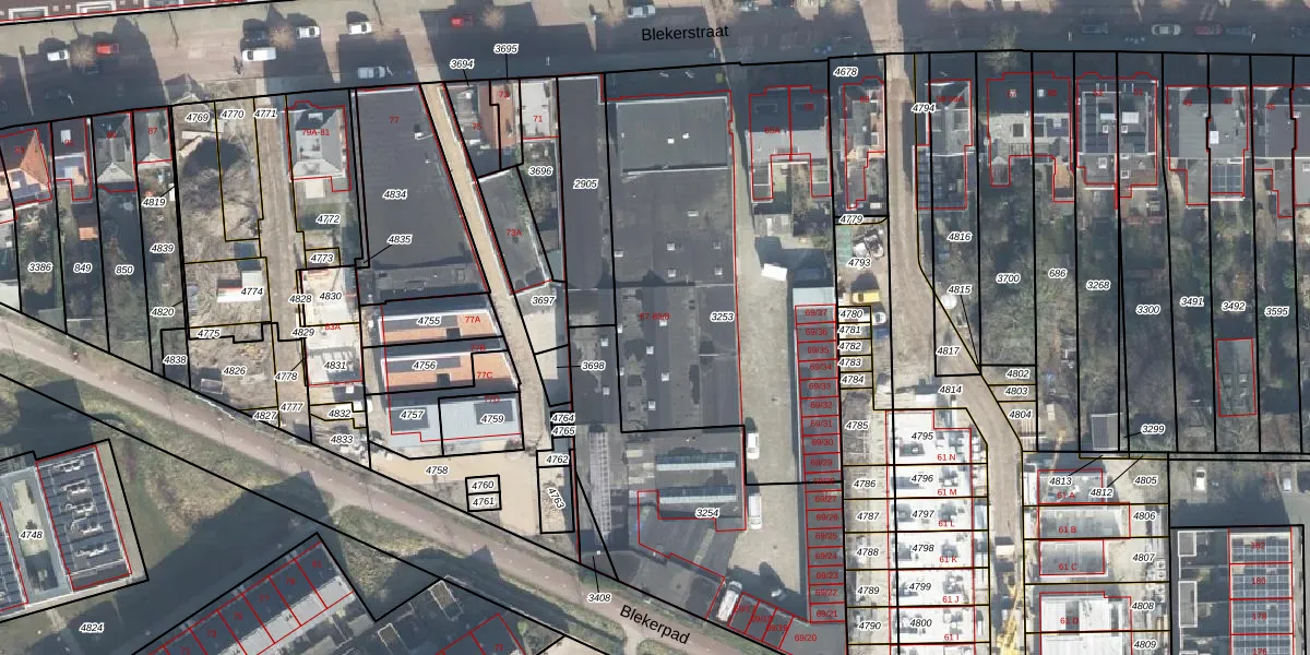 Het perceel waarop Blekerstraat 67-A staat heeft een oppervlakte van 2005 m². Dit is een zeer groot perceel. De perceeloppervlakte wordt geregistreerd door het Kadaster. Gedetailleerde informatie over de maten van dit perceel kunt u vinden in het rapport Kadastrale kaart met maatvoering van Blekerstraat 67-A.