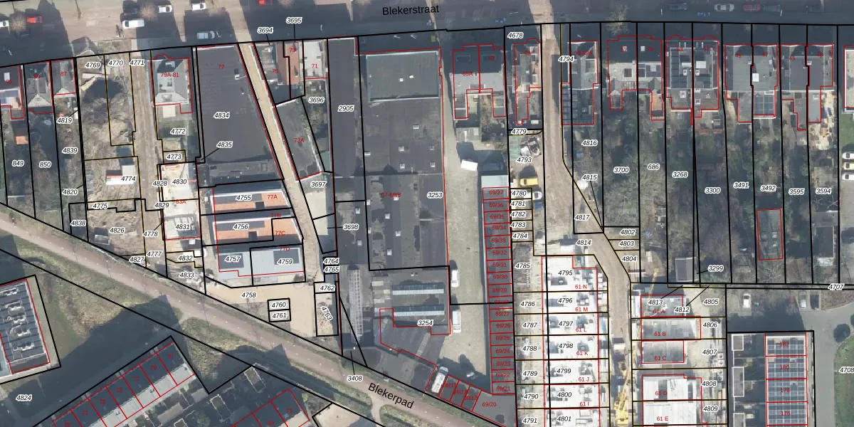 Het perceel waarop Blekerstraat 69-3 staat heeft een oppervlakte van 2005 m². Dit is een zeer groot perceel. De perceeloppervlakte wordt geregistreerd door het Kadaster. Gedetailleerde informatie over de maten van dit perceel kunt u vinden in het rapport Kadastrale kaart met maatvoering van Blekerstraat 69-3.