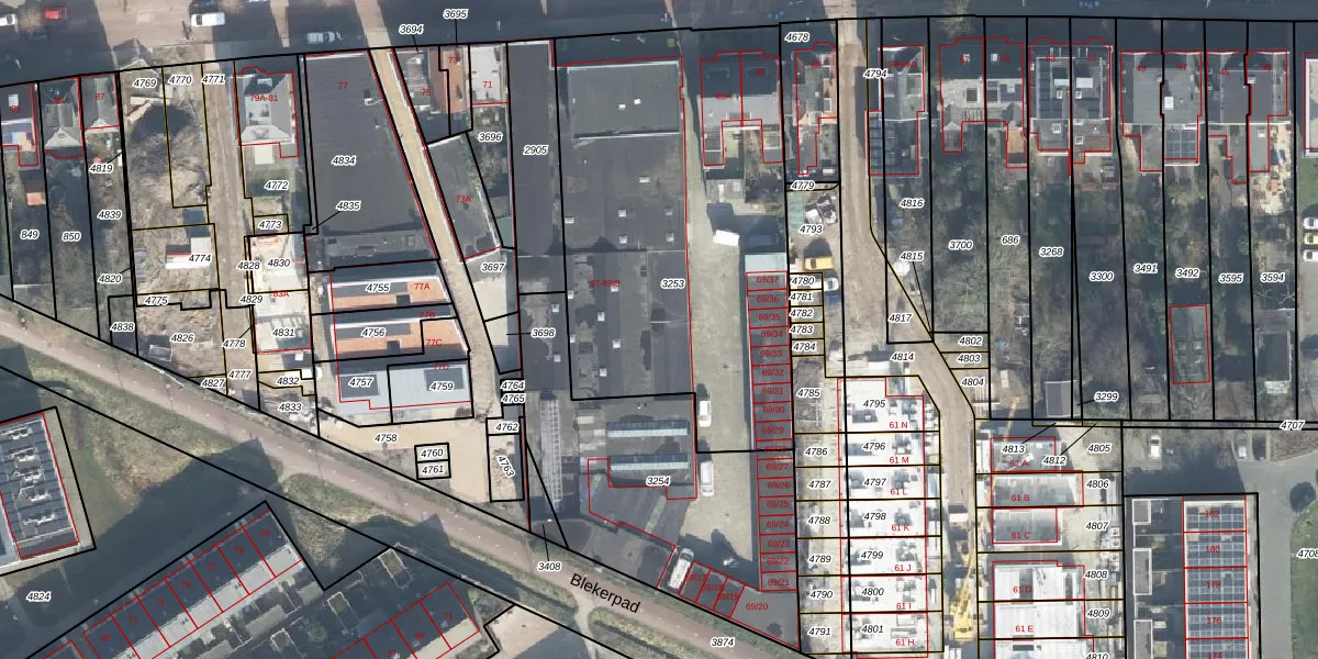 Het perceel waarop Blekerstraat 69-4 staat heeft een oppervlakte van 2005 m². Dit is een zeer groot perceel. De perceeloppervlakte wordt geregistreerd door het Kadaster. Gedetailleerde informatie over de maten van dit perceel kunt u vinden in het rapport Kadastrale kaart met maatvoering van Blekerstraat 69-4.
