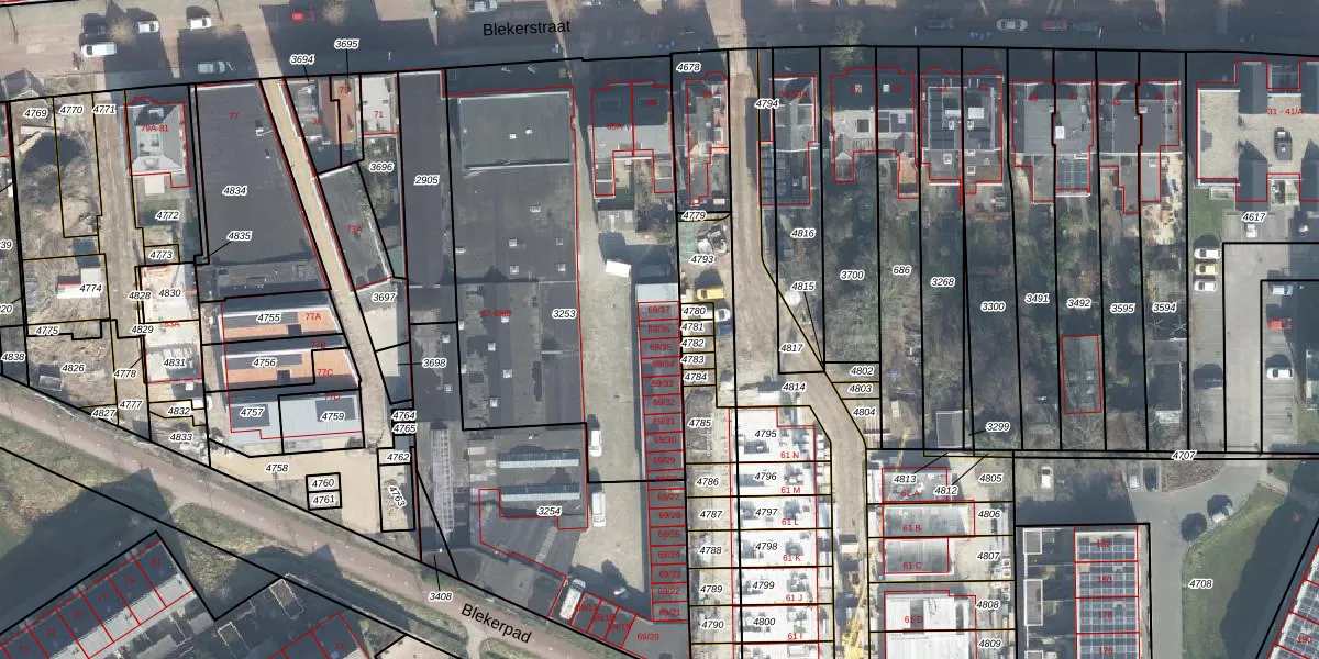 Het perceel waarop Blekerstraat 69-36 staat heeft een oppervlakte van 2005 m². Dit is een zeer groot perceel. De perceeloppervlakte wordt geregistreerd door het Kadaster. Gedetailleerde informatie over de maten van dit perceel kunt u vinden in het rapport Kadastrale kaart met maatvoering van Blekerstraat 69-36.